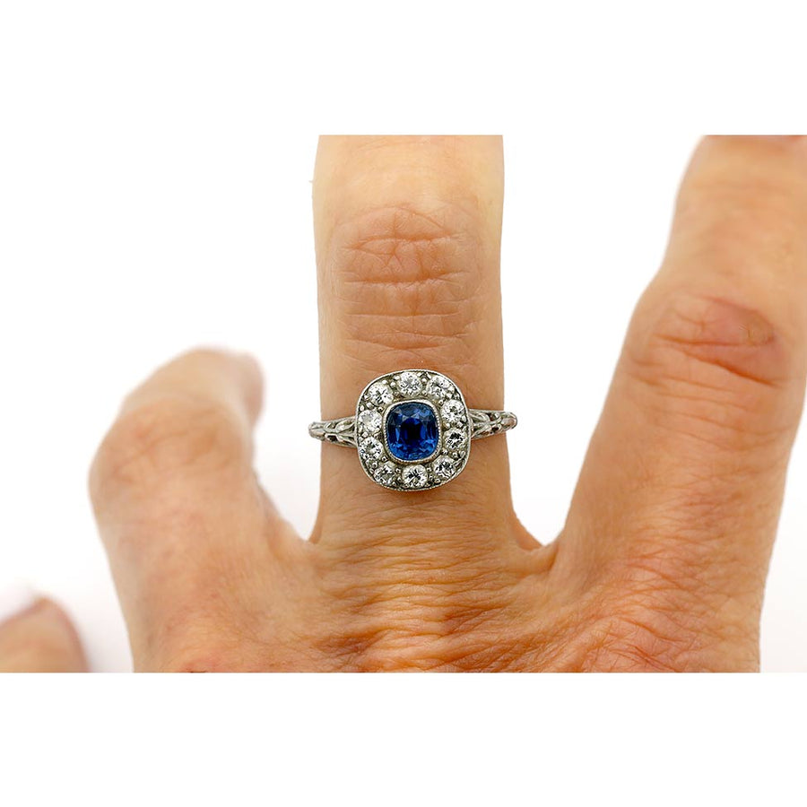 Antique Ceylon 1.10 CTW Sapphire European Cut Diamond Halo Vintage Engagement Ring