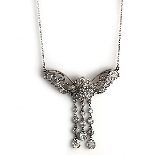 The Eve necklace is an authentic antique diamond necklace. This ravishing antique butterfly necklace dating back to the first decade of the last century, showcases 28 glittering old European cut diamonds weighing 5.00 carats (H color and VS2 clarity). Magnificently hand crafted in platinum atop 18 kt yellow gold with 3 rows of dangling old European cut diamond drops. Stunning, sophisticated and timeless. They don't come any finer. In pristine condition.