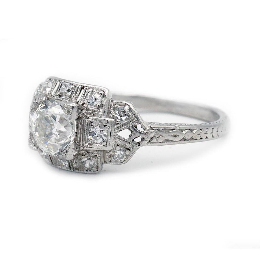 The Lorraine ring is an authentic vintage engagement ring dating to the Art Deco era of the 1930s. At its center is a GIA-certified .77 carat Old Mine cut diamond, graded I color and SI1 clarity, set within a crisp geometric square frame. The center stone is accented by thirteen single-cut diamonds, adding refined brilliance to the design. Handcrafted in platinum, the setting is finished with delicate milgrain and fine filigree engraving—hallmarks of classic Art Deco craftsmanship. A beautiful and increasingly hard-to-find vintage engagement ring, offered in very good vintage condition.