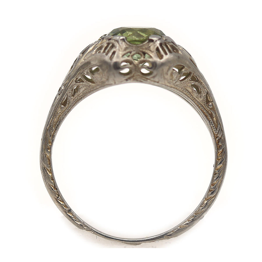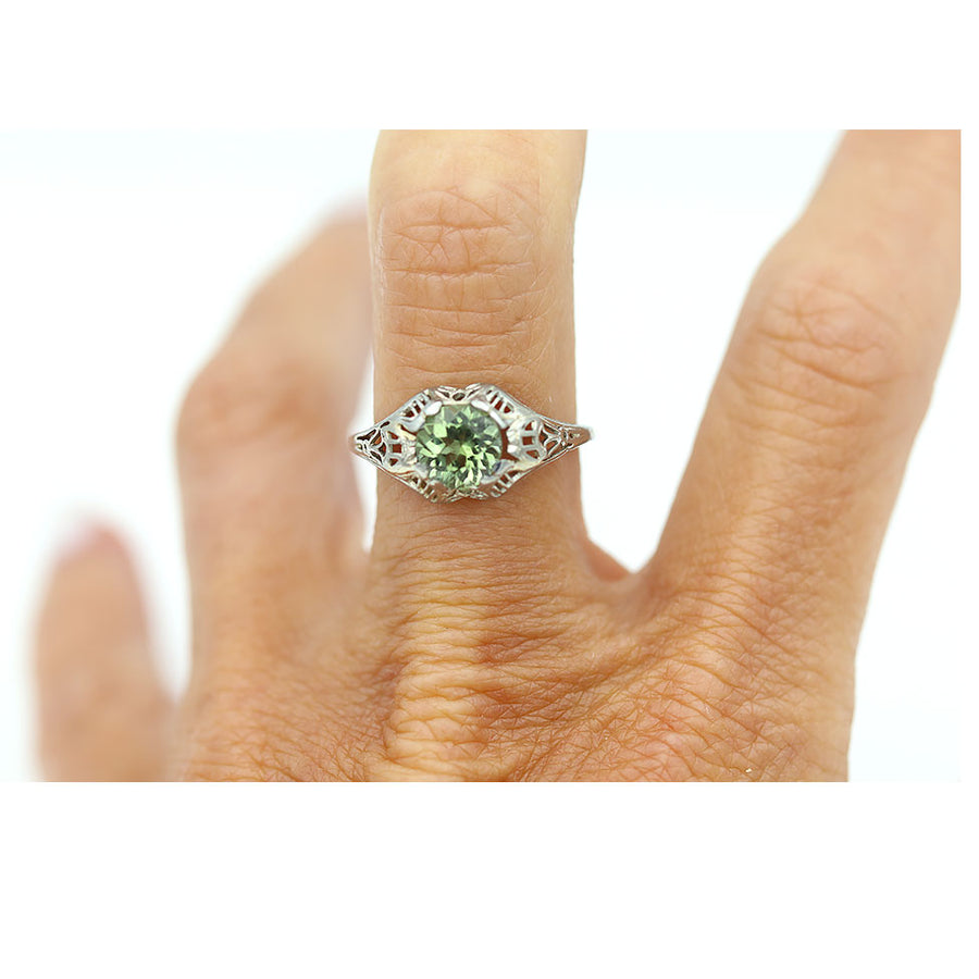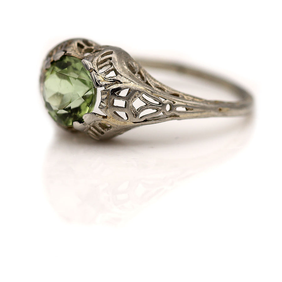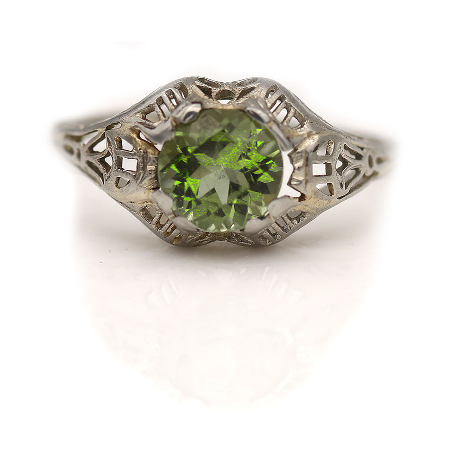 The Liatta ring is an authentic vintage engagement ring from the Art Deco era, circa 1930s. This ring features a natural 1.30 carat deep green, round cut tourmaline. Crafted in 14 kt white gold, and accentuated with open metal work and filigree engravings, this is a sweet Art Deco piece. In good condition.