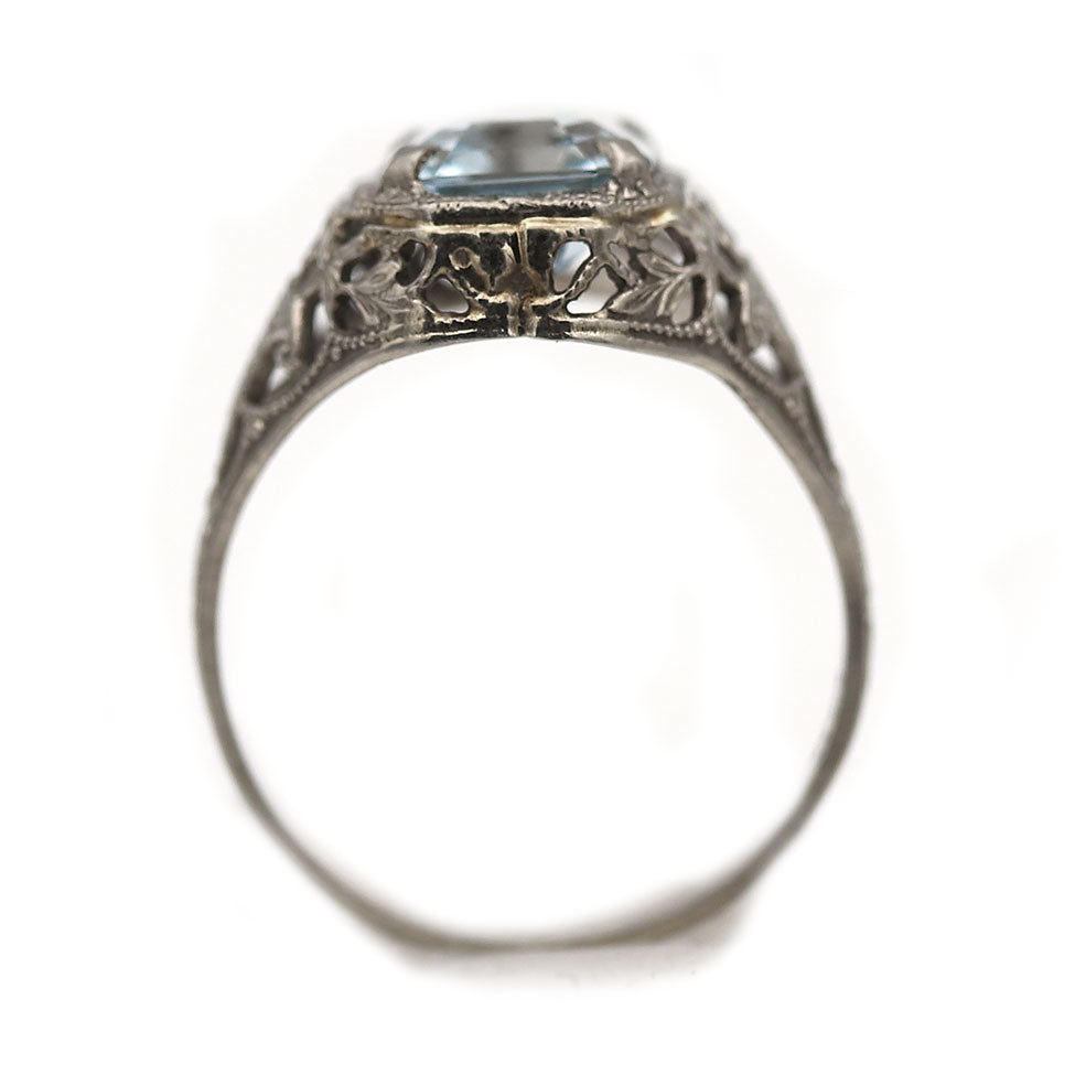 The Sinta ring is an authentic Art Deco aquamarine engagement ring, circa 1930s featuring a natural, prong set square cut 1.85 carat aquamarine. Beautifully crafted in 14 karat white gold, and accentuated with open metal work and filigree engravings. This is a stunning non-diamond engagement ring, in very good condition.