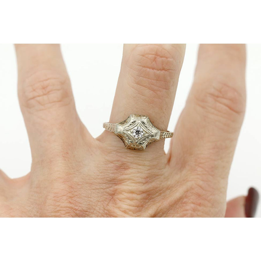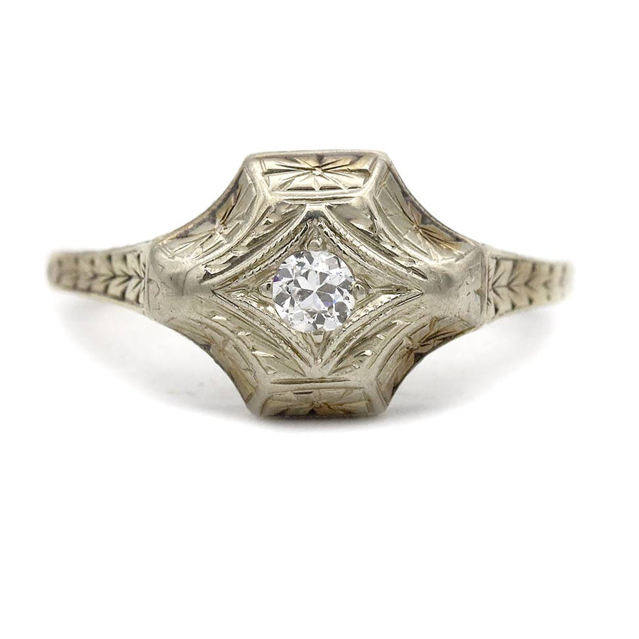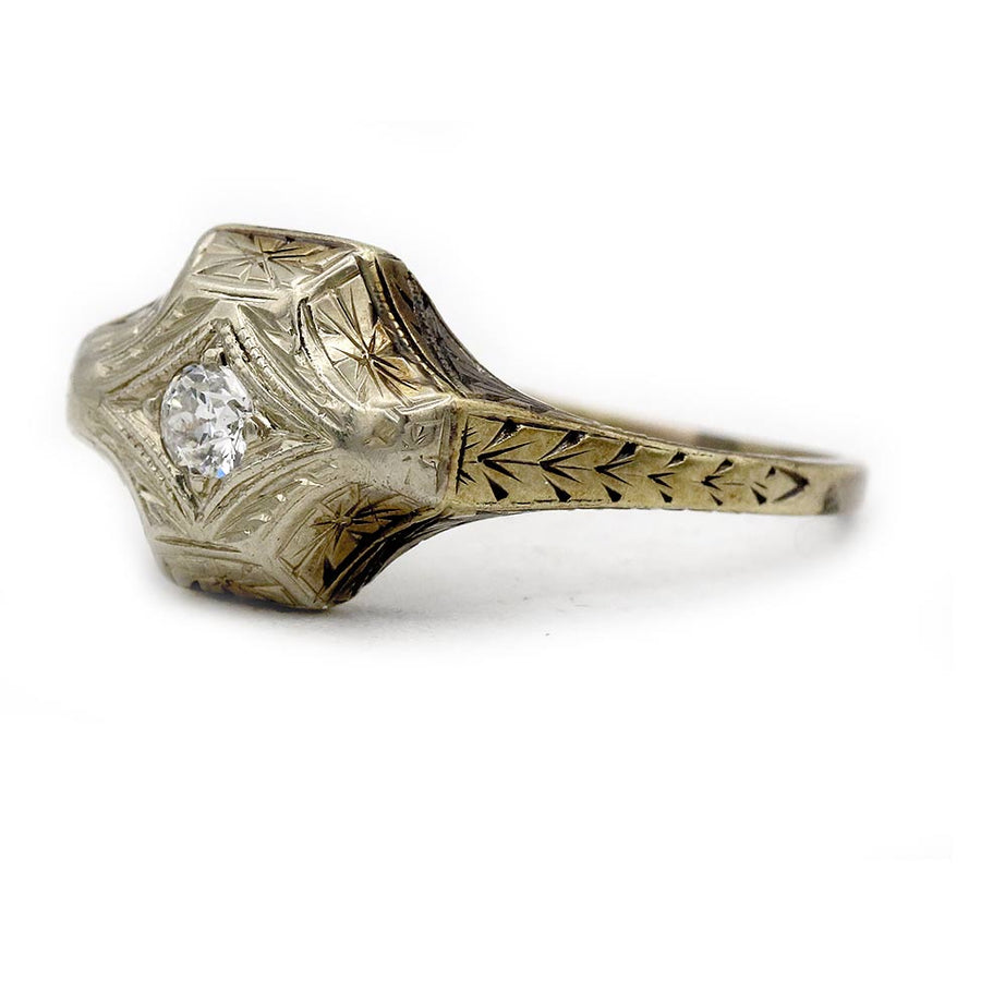 The Lilly ring is an authentic vintage engagement ring from the Art Deco era, dating to the 1930s. It features a .15 carat Old European cut diamond of F color and VS2 clarity, set within a crisp four-sided geometric frame. Crafted in 14 karat two tone gold and finished with delicate filigree detailing, this is a refined Art Deco solitaire offered in very good vintage condition.