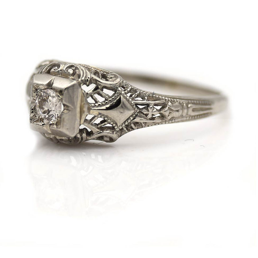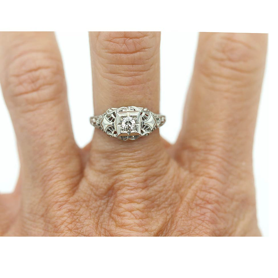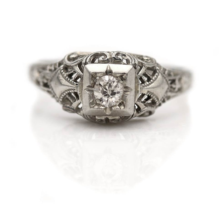 The Zendata ring is an authentic vintage engagement ring from the Art Deco era circa 1930's. The ring features a bright-white .15 carat old mine cut diamond of F color and SI2 clarity, residing in a geometric square frame. Beautifully crafted in 18 kt white gold, and accentuated with open metal work and intricate filigree and milgrain engravings. A rare vintage jewel, in very good condition.