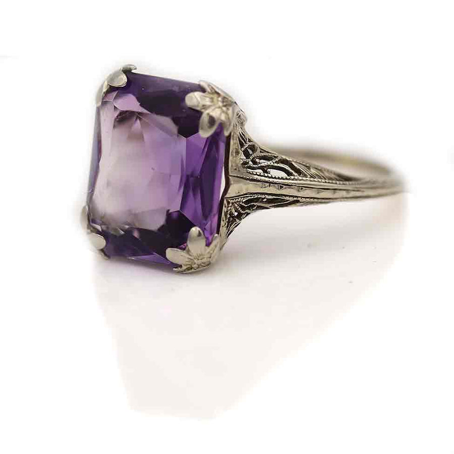 The Nero ring is an authentic vintage amethyst engagement ring from the Art Deco era, circa 1930s. This ring features a floral, prong set, 2.50 carat natural emerald cut amethyst standing tall and proud in a vintage 14 kt white gold setting, adorned with open metal work and milgrain engravings. A sweet alternative ring. In very good condition.