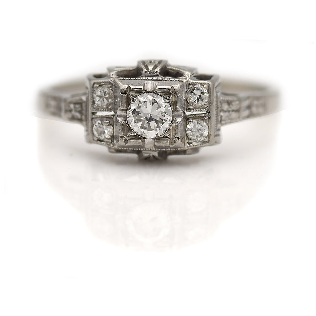 The Buzca ring is an authentic vintage engagement ring from the Art Deco era, circa 1930's. This ring showcases a dynamic .15 carat old European cut diamond residing in a geometric square frame, surrounded by four (4) old European cut diamond accents. Beautifully crafted in 18 kt white gold, and accentuated with delicate milgrain engravings. A timeless and classic Art Deco jewel in very good condition.
