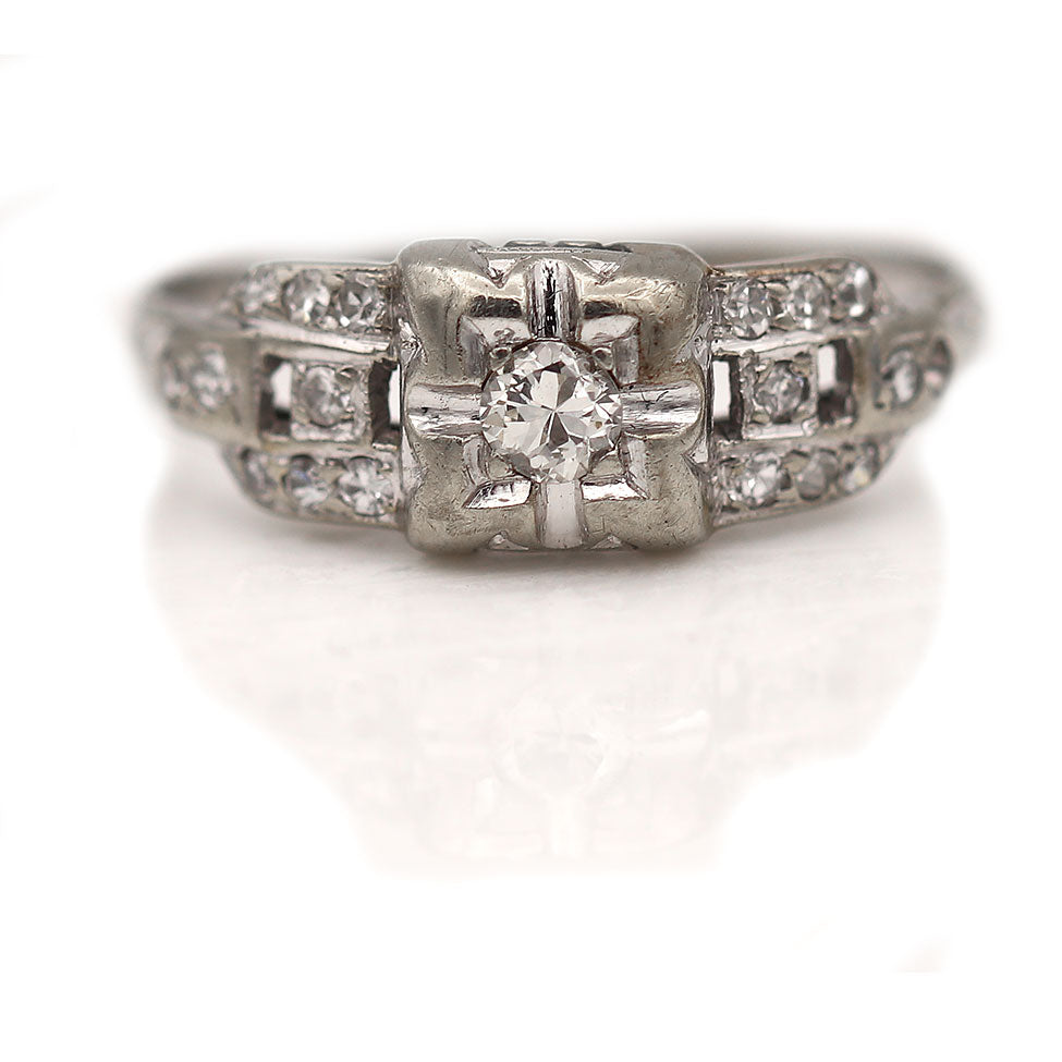 The Evergreen ring is an authentic vintage engagement ring from the Art Deco era circa 1930's. The ring features a .10 carat old European cut diamond of F color, VS2 clarity, residing in a geometric square frame. The diamond is flanked by 18 side tiered single cut diamond accents. Crafted in 18 karat white gold, completed with filigree engravings. A classic and timeless vintage ring. In good condition.