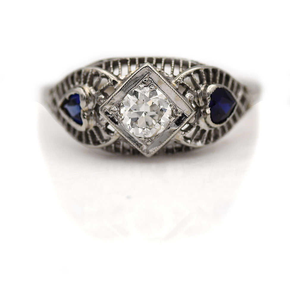 The Tara ring is an authentic antique engagement ring from the Art Deco era circa 1930's. The ring features a .25 carat old European cut diamond of F color SI1 clarity, residing in a geometric 4-sided frame. The diamond is flanked by 2 synthetic bezel set heart shaped sapphire accents. Beautifully crafted in 14 karat white gold, accentuated with open metal work and delicate filigree engravings. A magnificent vintage ring. Timeless in every way. In excellent condition.