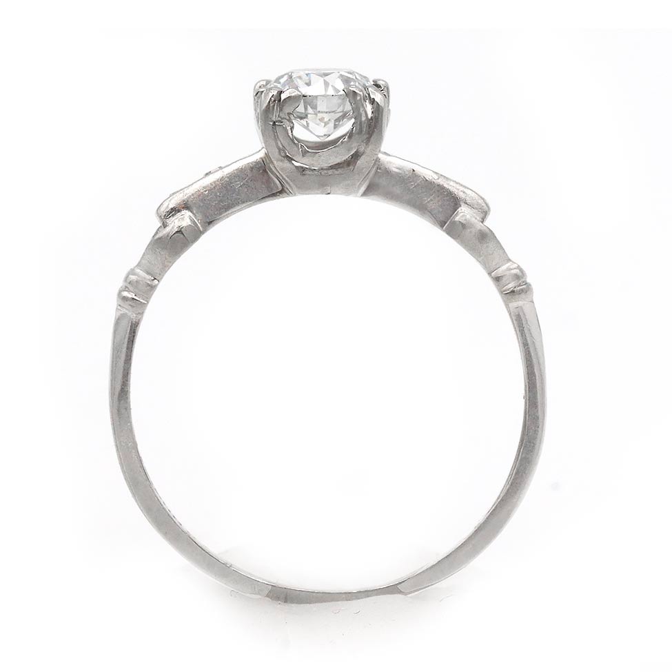 The Cori ring is an authentic vintage engagement ring circa 1940s. The ring features a .65 carat GIA certified old European cut diamond of J color and VS2 clarity, residing within trefoil prongs. The diamond is flanked by six single cut diamond accents. Beautifully crafted in platinum, accentuated with delicate engravings. A classic piece, in very good condition.