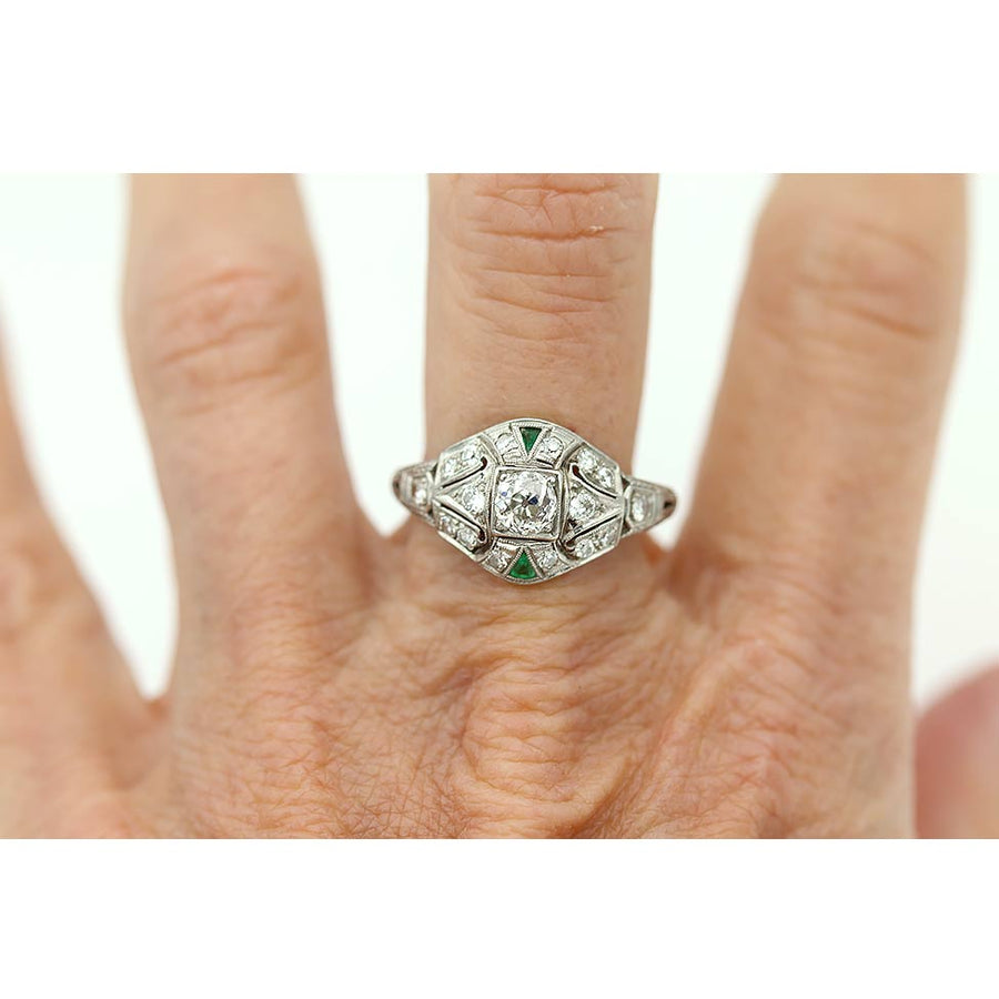 Art Deco .77 CTW Old Mine Cut Vintage Diamond Emerald Engagement Ring