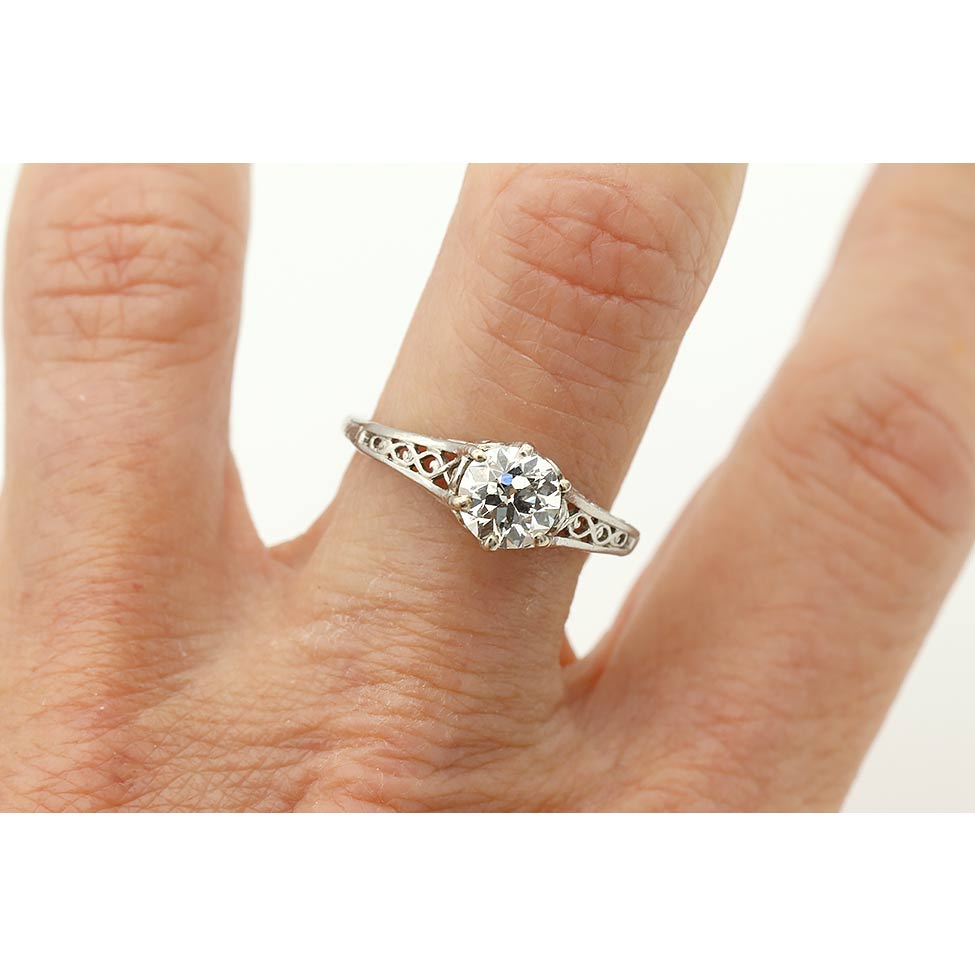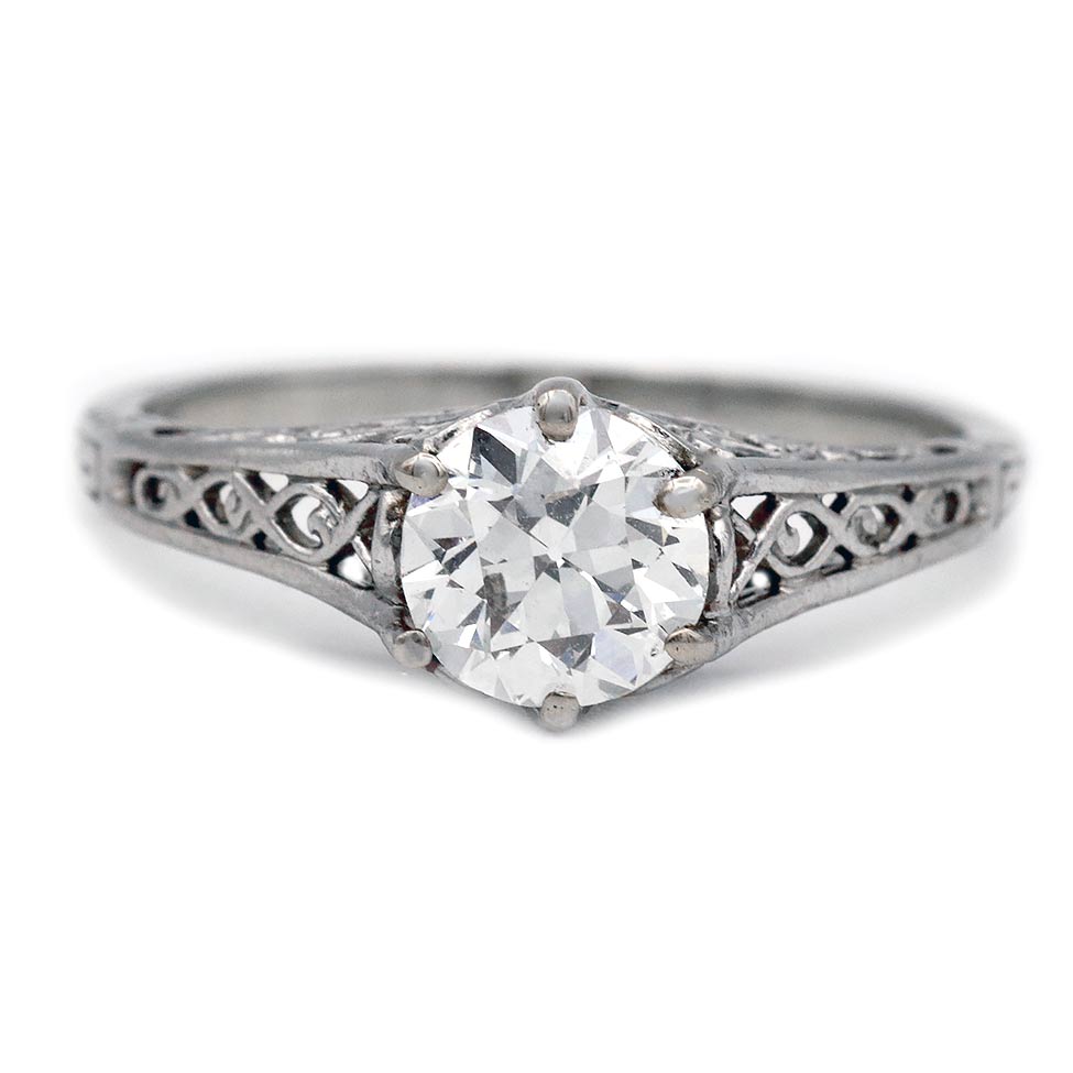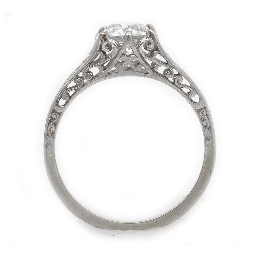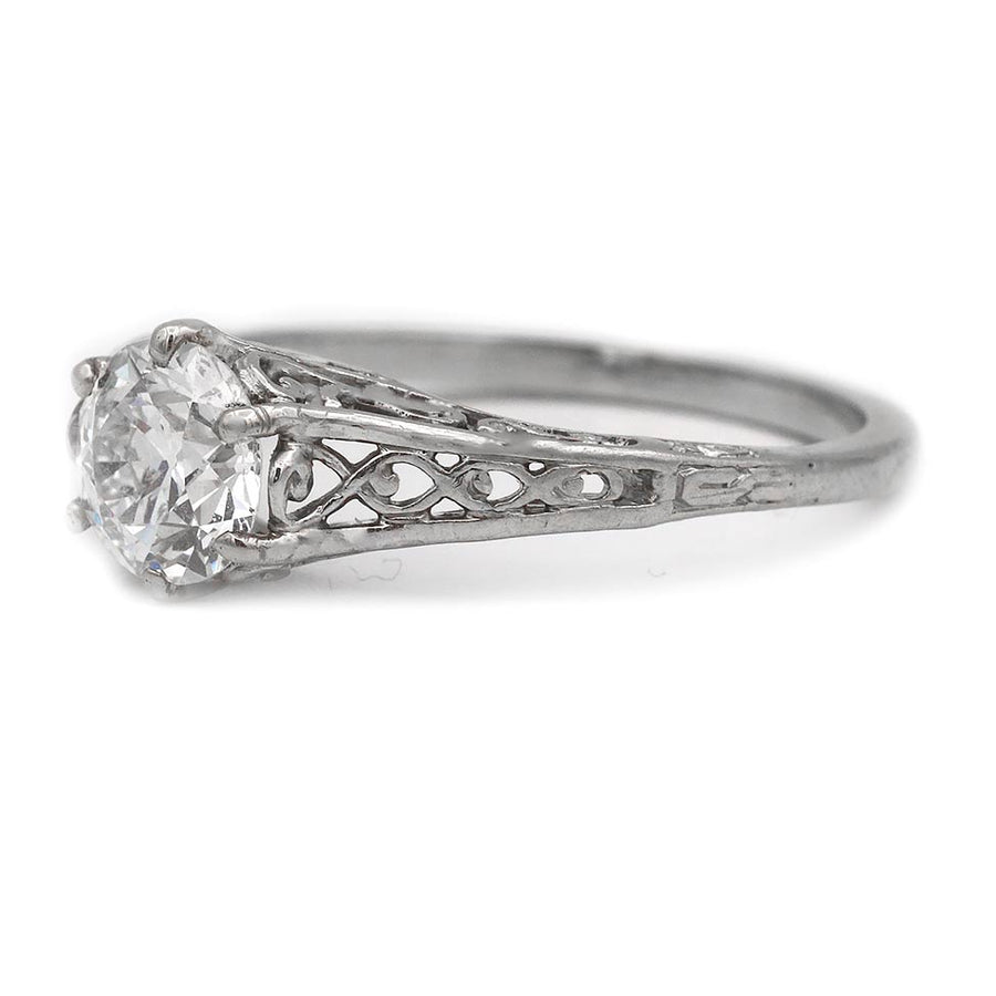 The Amilet ring is an authentic vintage engagement ring from the Art Deco era, dating to the 1930s. At its center is a GIA-certified .98 carat Old European cut diamond, graded I color and VS2 clarity, prized for its soft brilliance and antique character. Crafted in platinum, the setting is beautifully detailed with graceful swirls of open metalwork and period engraving, hallmarks of fine Art Deco craftsmanship. A rare and elegant vintage solitaire, offered in very good condition.