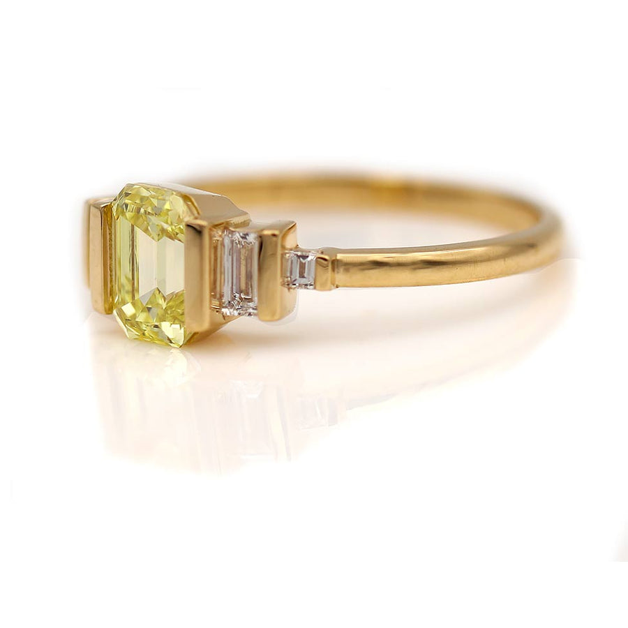 The Soo ring is a VintageDiamondRing.com vintage style engagement ring. This original ring features an authentic 1980s .76 carat (bar set) GIA emerald cut diamond with natural fancy Intense yellow even color. Flanked by four (4) vintage baguette cut diamonds, it is beautifully crafted in recycled 18 kt yellow gold, and made with love in NYC. A beautiful alternative engagement. Magnifique!