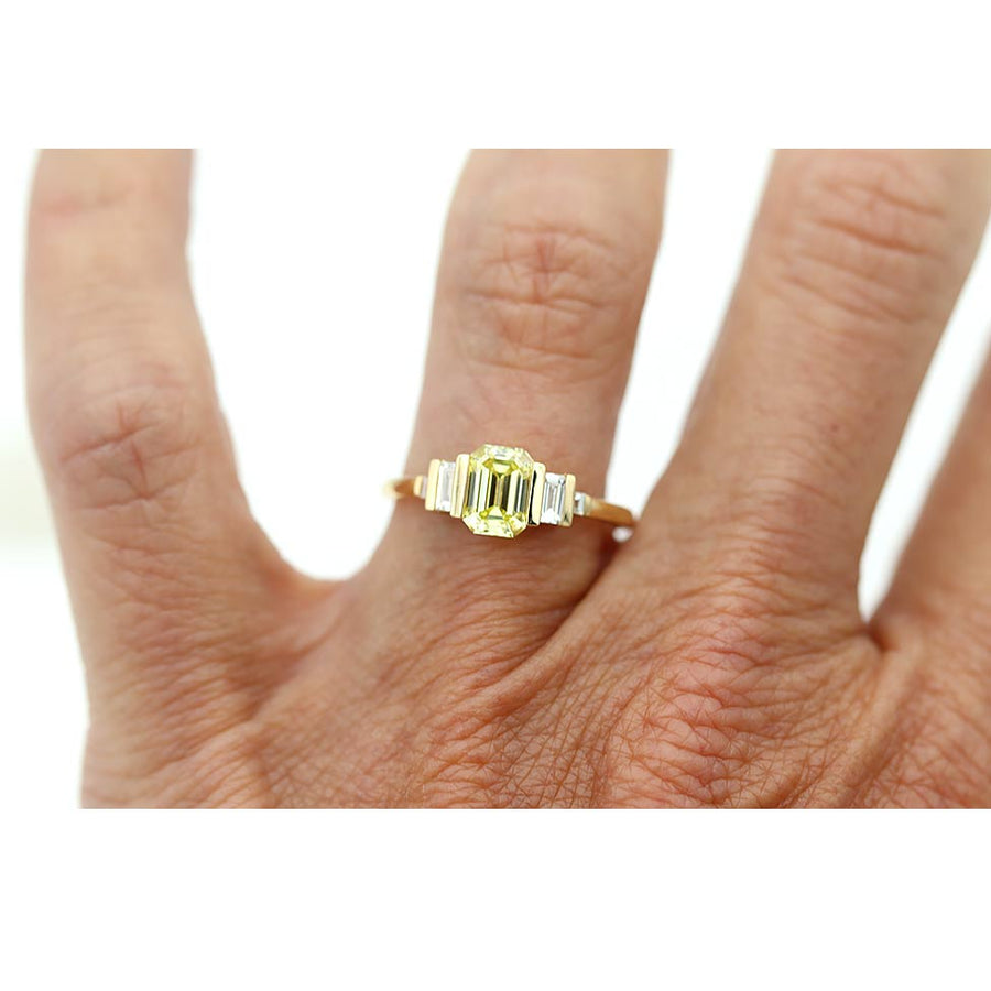 The Soo ring is a VintageDiamondRing.com vintage style engagement ring. This original ring features an authentic 1980s .76 carat (bar set) GIA emerald cut diamond with natural fancy Intense yellow even color. Flanked by four (4) vintage baguette cut diamonds, it is beautifully crafted in recycled 18 kt yellow gold, and made with love in NYC. A beautiful alternative engagement. Magnifique!