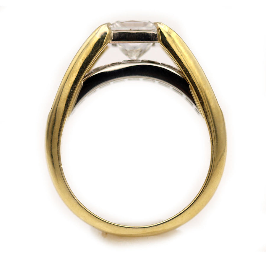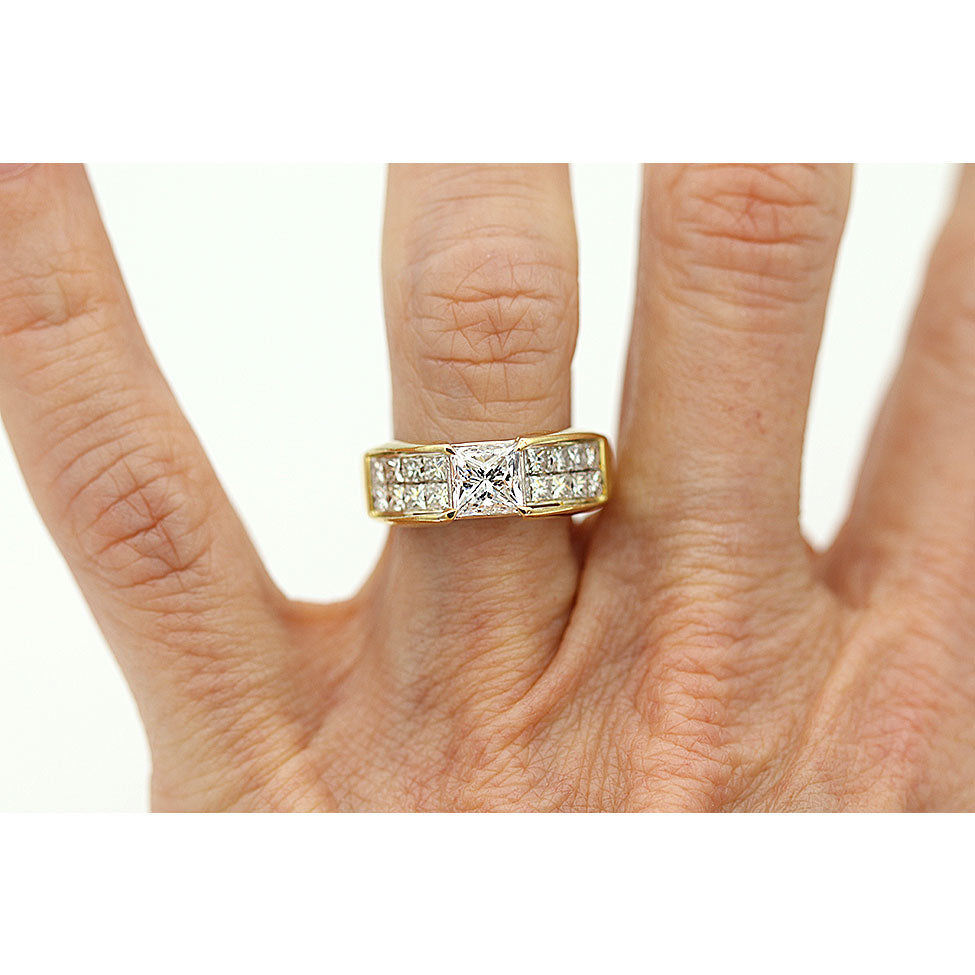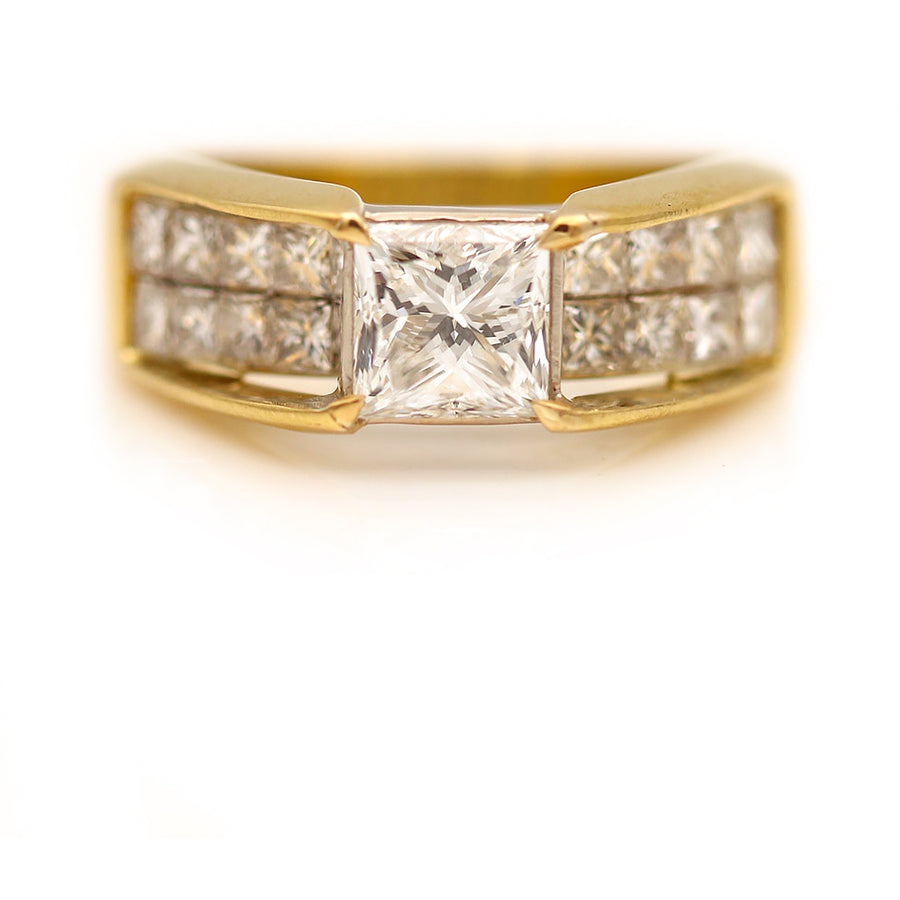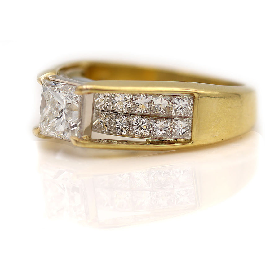 The Peggi ring is an authentic vintage engagement ring circa 1980s, featuring a 1.20 carat GIA certified princess cut diamond of E color and SI2 clarity. This diamond is flanked by twenty two (22) invisibly set princess cut diamond accents, weighing approximately 1.20 carat. Beautifully crafted in 18 kt yellow gold, this is a magnificent vintage piece, in very good condition. Perfect to wear on either hand!