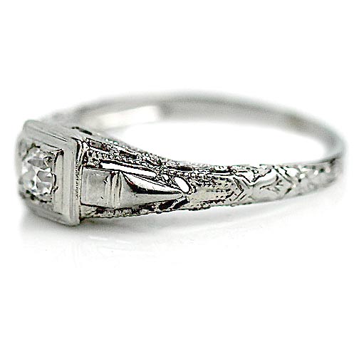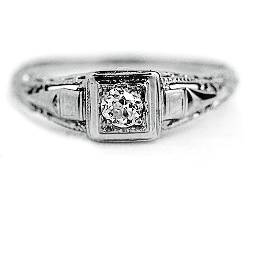 The Angie ring is an authentic vintage ring from the Art Deco era circa 1920’s.  The ring features a .15 carat old European cut diamond of G color, SI1 clarity, residing in a geometric square frame.  To each side of the diamond is two delicate linear square engravings.  Crafted in 14 karat white gold, completed with milgrain engravings and an open work gallery.  A sweet vintage promise ring, in very good condition.