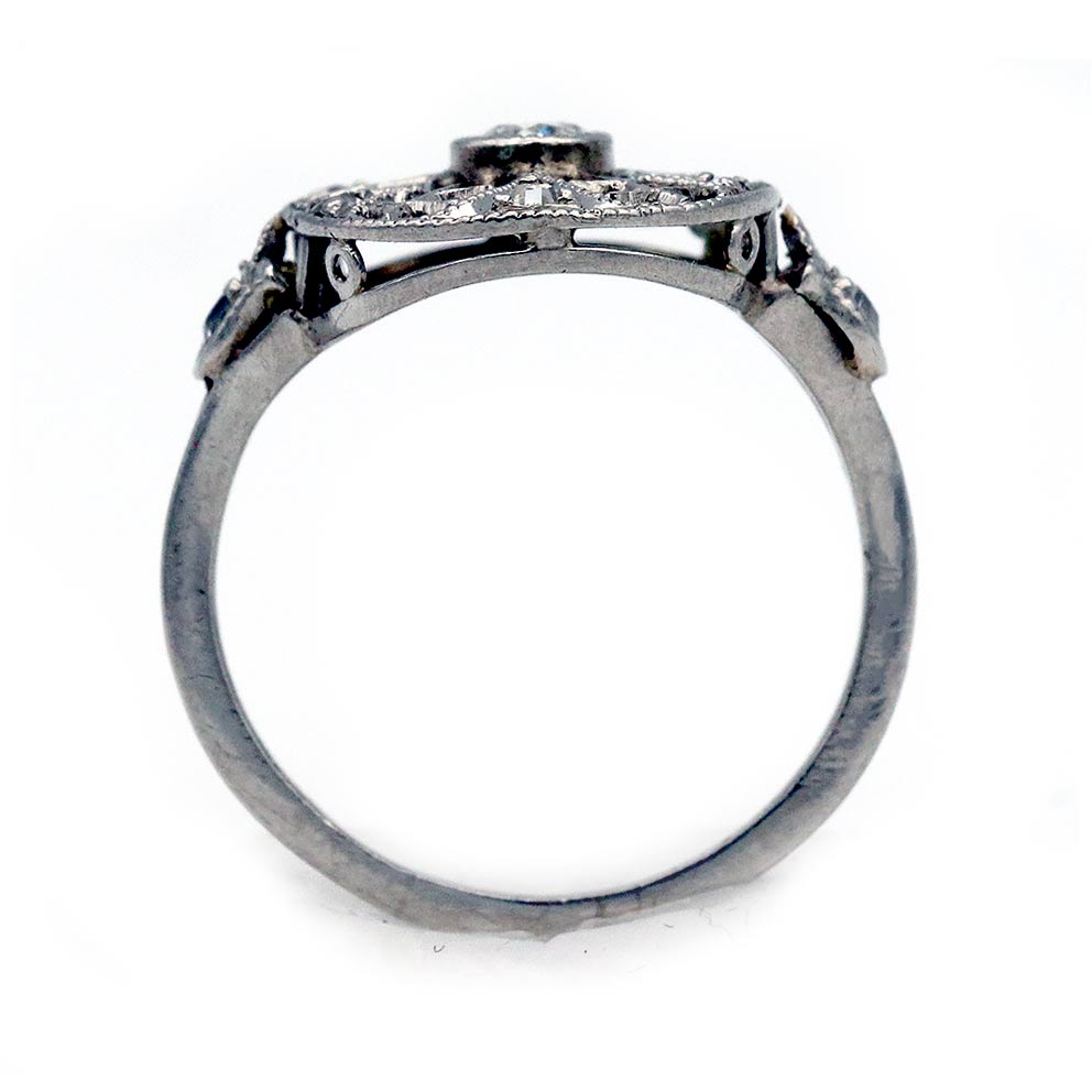 The Kendall ring is an authentic Edwardian engagement ring circa 1920's. The ring showcases a bezel set .20 carat old European cut diamond, surrounded by 6 old European cut diamonds. Beautifully crafted in platinum, accentuated with open metal work and milgrain engravings. A lovely low-profile vintage jewel, in very good condition. Perfect to wear on your left or right hand.