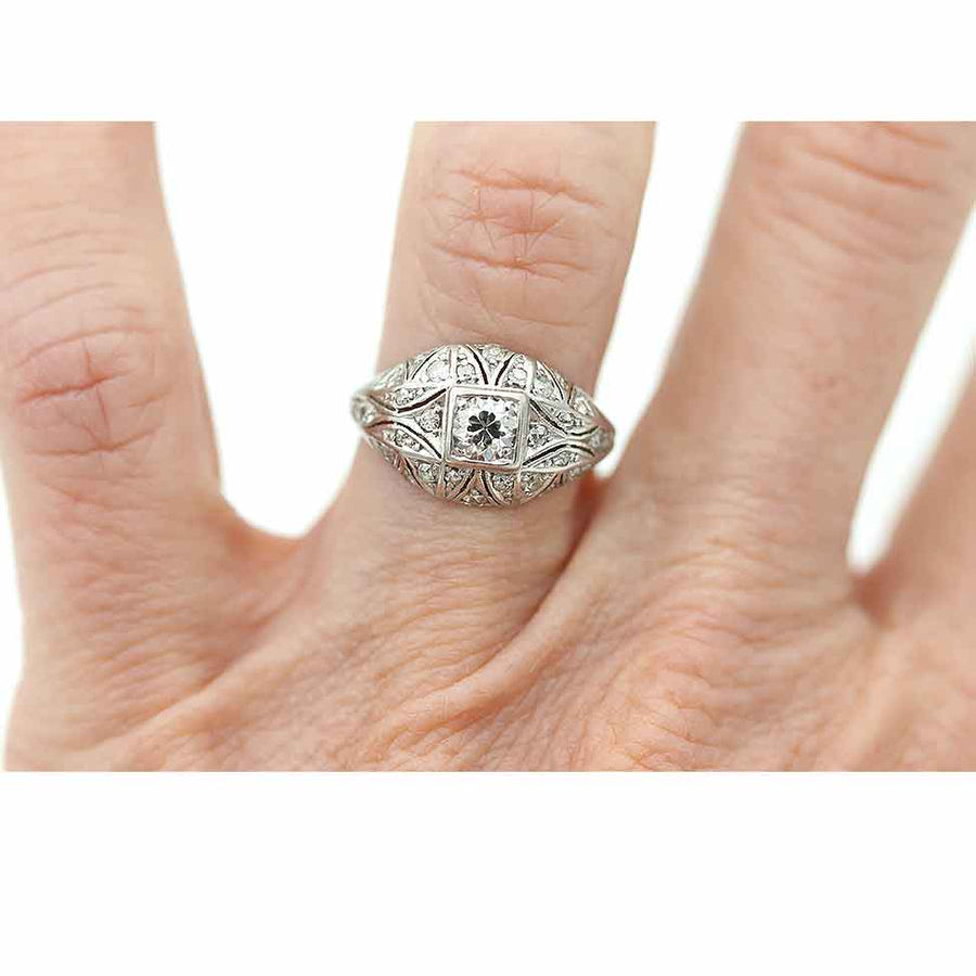 The Simon ring is an authentic Edwardian engagement ring from the 1920s centered with a .30 carat old European cut diamond of I color and VS2 clarity. The center stone is held in a geometric square frame and surrounded by thirty-two glittering rose and single cut diamond accents. Beautifully crafted in platinum, the mounting features delicate milgrain engravings and fine openwork typical of the era. A lovely antique piece that balances a structured silhouette with soft, vintage sparkle. Offered in good condition. Ready to ship.