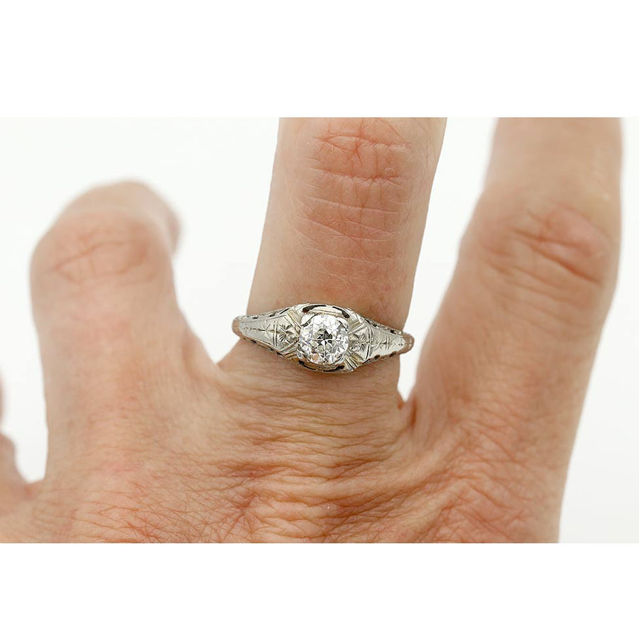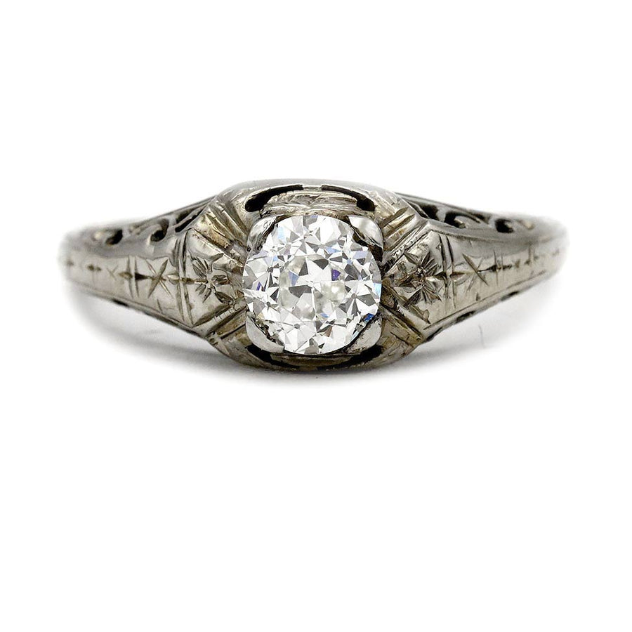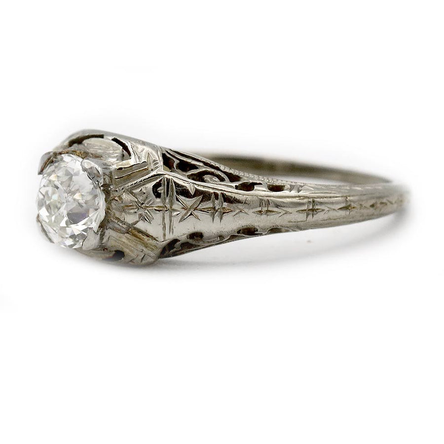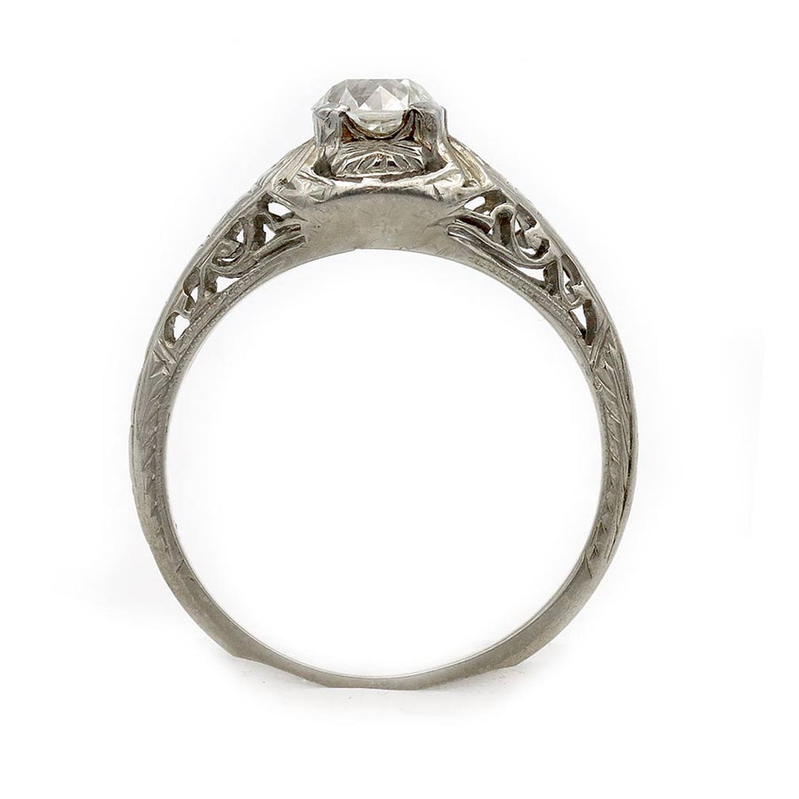 The Royce ring is a late Art Deco Diamond Engagement Ring circa 1940's. The ring features a bright-white .60 carat old cushion cut diamond of H color, VS2 clarity. Beautifully crafted in 18 karat white gold, accentuated with open metal work and delicate filigree engravings. A sleek, elegant vintage piece, with the perfect amount of patina. In very good condition.