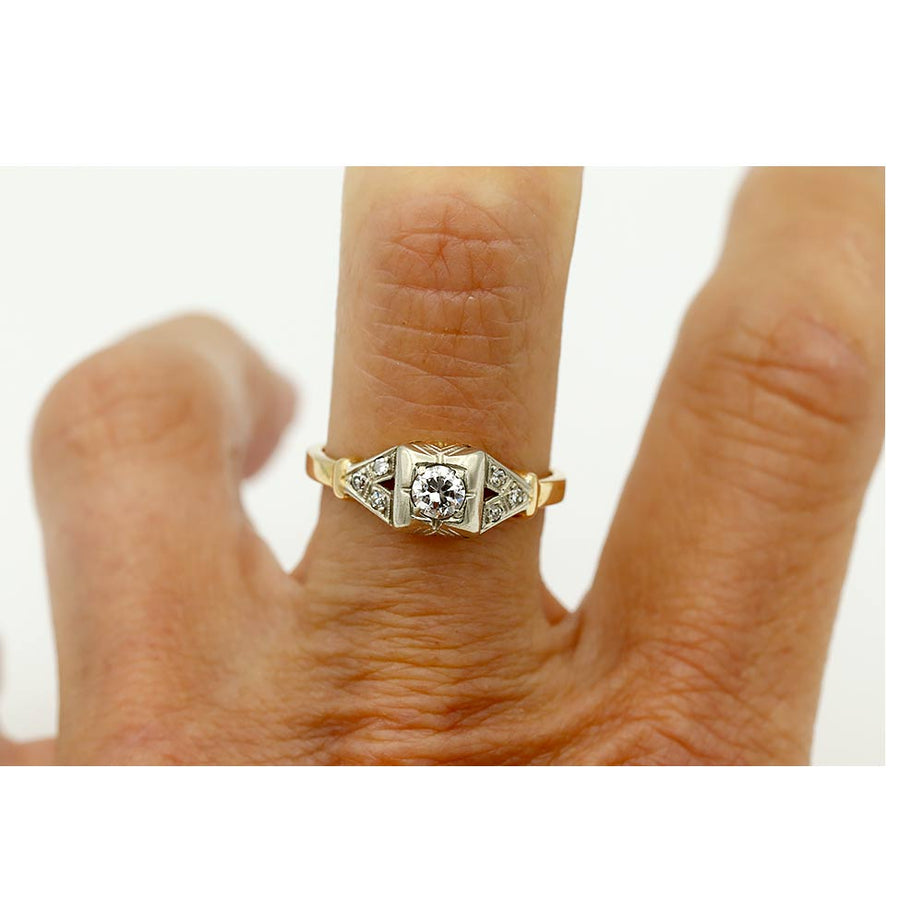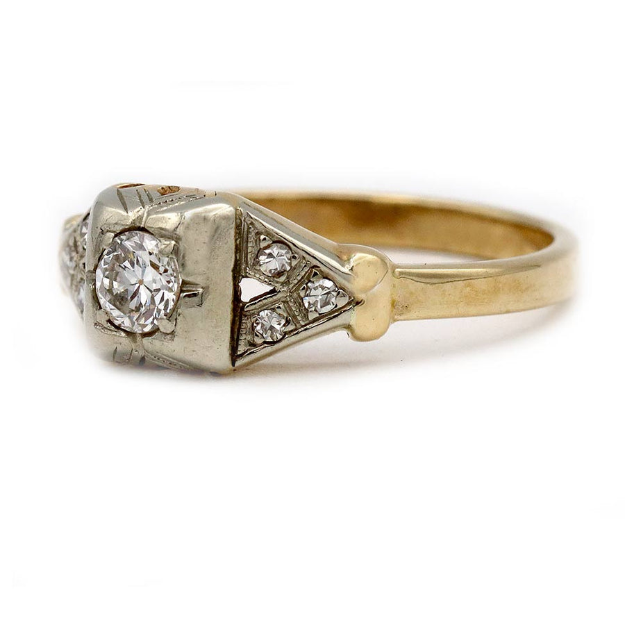 The Denise ring is an authentic vintage diamond ring from the 1940s. The ring showcases a .25 carat old European cut diamond of F color, VS2 clarity, residing in a geometric square frame. The diamond is flanked by 6 single cut diamond accent, residing within a very sleek split shank. Crafted in a 14 karat white gold, atop a 14 karat yellow gold ring. Clean, crisp and just so lovely. In excellent condition.