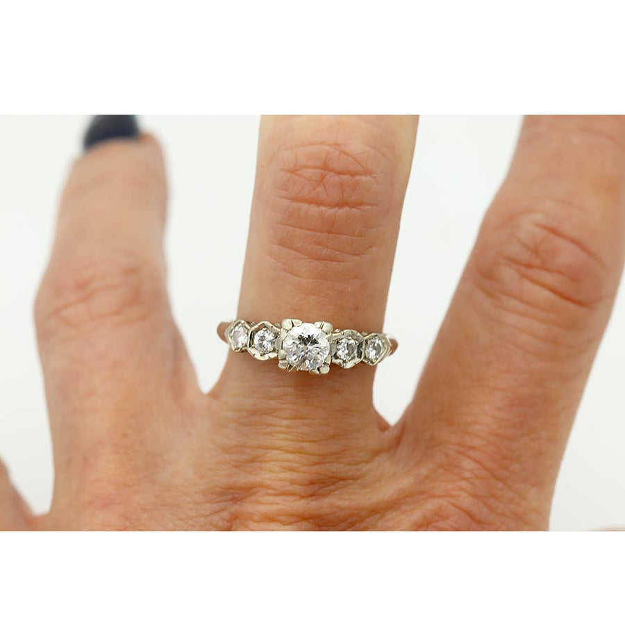 The Sherrie ring is an authentic vintage engagement ring circa 1940s. The ring showcases a bright-white .40 carat old transitional cut diamond of G color, SI2 clarity, residing within trefoil prongs. The diamond is flanked 4 dazzling transitional cut diamond accents. Crafted in 14 karat white gold. A sleek, elegant ring that is perfect to wear on either hand! In very good condition.