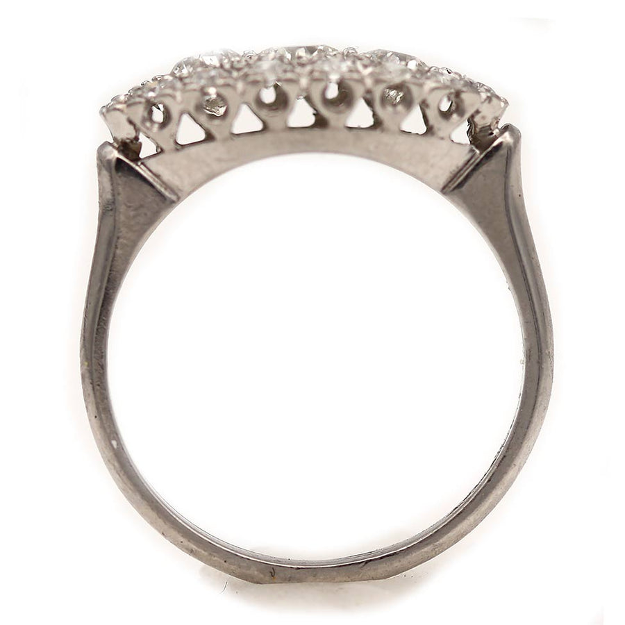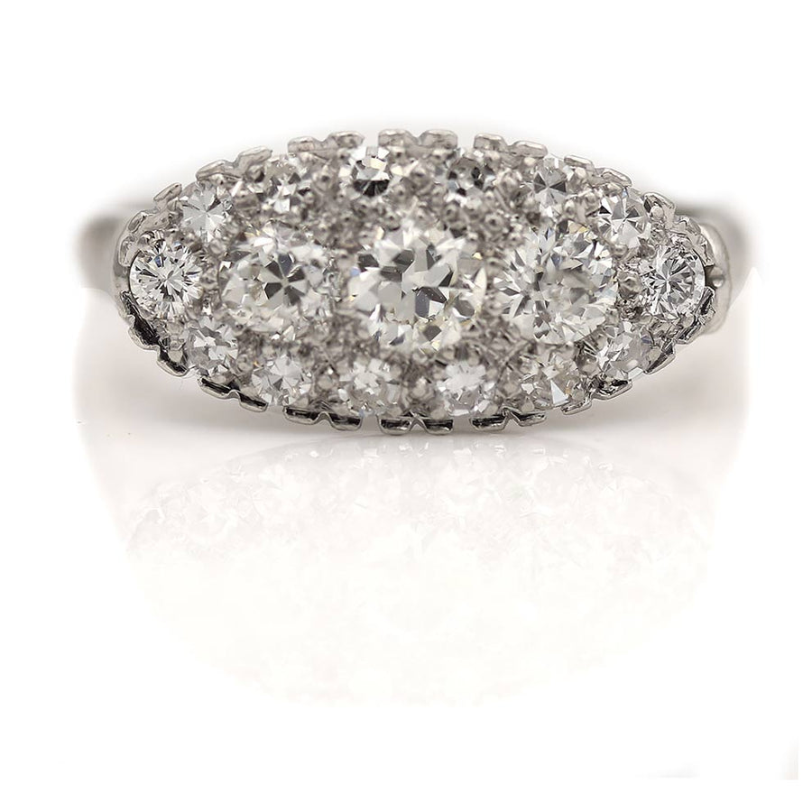 The Conte ring is an authentic vintage diamond three-stone wedding ring circa 1960s. This ring features a bright-white .25 carat old European cut of G color and VS2 clarity flanked by two old mine cut diamonds, weighing .30 ctw, surrounded by 14 pave set transitional and single cut diamond accents. Beautifully crafted in platinum, this is a captivating jewel. Perfect to wear on either hand. In very good condition.
