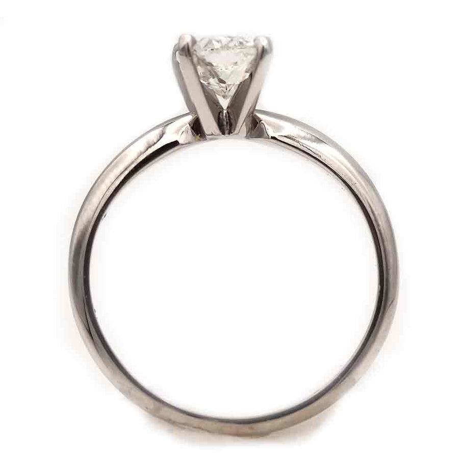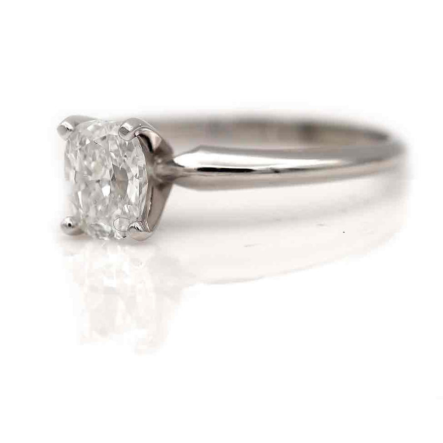 The Rosemary C ring is an authentic vintage cushion cut engagement ring, circa 1990's. This ring features a glittering .94 carat GIA certified cushion cut diamond of H color VS2 clarity. Beautifully crafted in 14 kt white gold. A classic ring, in very good condition.