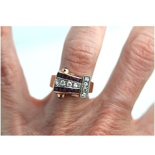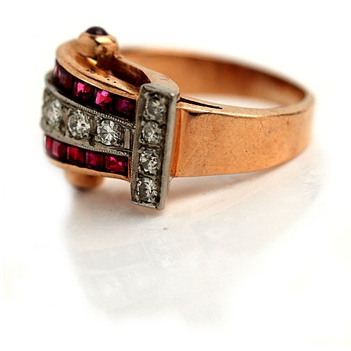 Retro Ruby & Old European Cut Diamond Engagement Ring in Rose Gold | 1940s