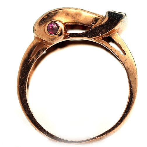 The Kateri ring is an authentic vintage cocktail ring from the Retro era, dating to the 1940s. It features eight old European cut diamonds arranged at the center, surrounded by twelve natural square cut Burma rubies and two Burma cabochon rubies, creating bold contrast and rich color. Beautifully crafted in gleaming 14K rose gold with contrasting white gold accents, this striking ring reflects the glamour and confidence of the Retro period. A ravishing and simply magnificent vintage jewel, preserved in excellent condition.