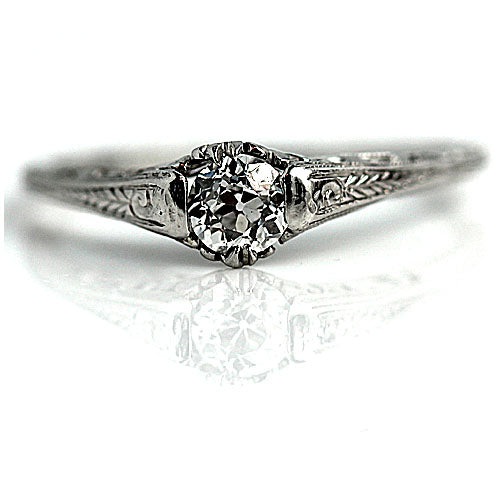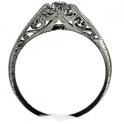 The Eiko ring is an authentic vintage engagement ring from the Art Deco Era circa 1930's. The ring features a .35 carat old European cut diamond of F color, SI1 clarity. Beautifully handcrafted in platinum, accentuated with swirls of open metal work, intricate filigree engravings and a tapered band. A sleek, classic engagement ring with a touch of vintage boldness! In very good condition.