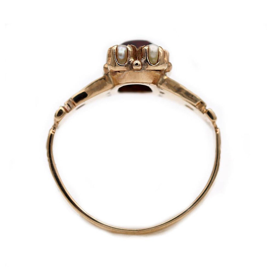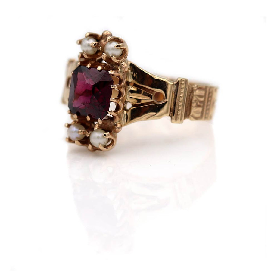 The Riala ring is an authentic Victorian garnet ring dating to the early 1900s. Centered with a natural .60 carat square-cut cabochon garnet in a deep purple hue, the design is accented by four seed pearls set north–south. Crafted in 10 karat rose gold, the setting features delicate filigree and subtle milgrain detailing characteristic of the Victorian era. A beautifully preserved antique jewel, offered in very good condition