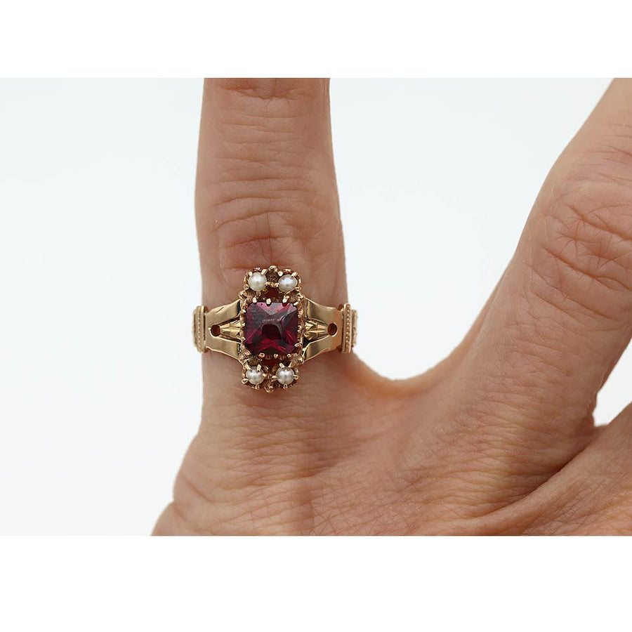 Victorian Square Garnet & Seed Pearl Engagement Ring in 10 Karat Rose Gold — .60 Ct