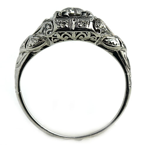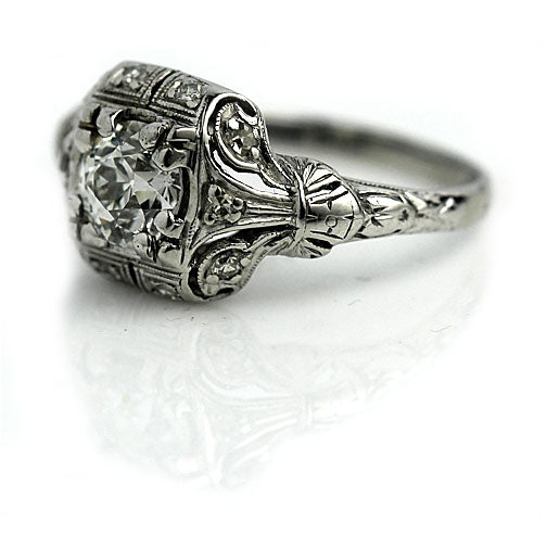 The Kimmie ring is an authentic Art Deco engagement ring circa 1930's. The ring features a dazzling AGI certified .70 carat old mine cut diamond of I color, VS2 clarity, residing in a geometric square frame. The diamond is surrounded by 10 single cut diamond accents. Beautifully crafted in platinum, accentuated with swirls of metal work and filigree engravings. A rare, one of a kind vintage ring. In pristine condition. They don't come any finer.