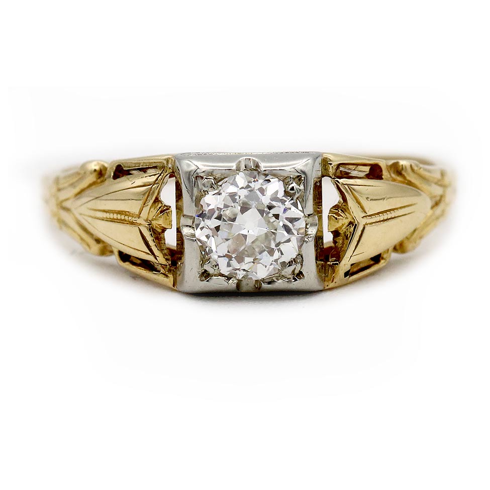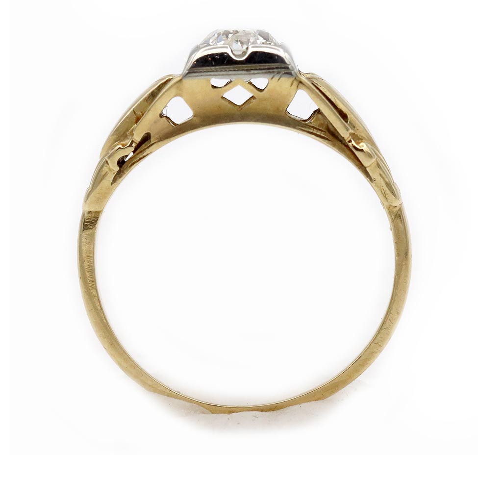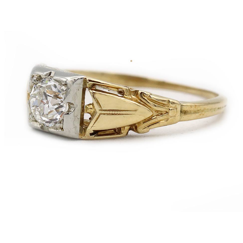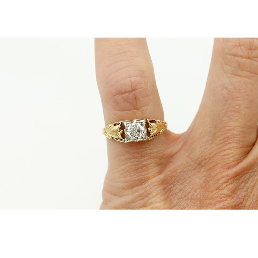 The Ivy ring is an authentic vintage engagement ring circa 1900s, featuring a .35 carat European cut diamond of H color, VS2 clarity, residing in a geometric square frame. The diamond is flanked by delicate linear filigree engravings. Crafted in 14 karat white gold frame atop 14 rosy-karat yellow gold ring, completed with milgrain engravings. A beautiful vintage piece, in excellent condition.