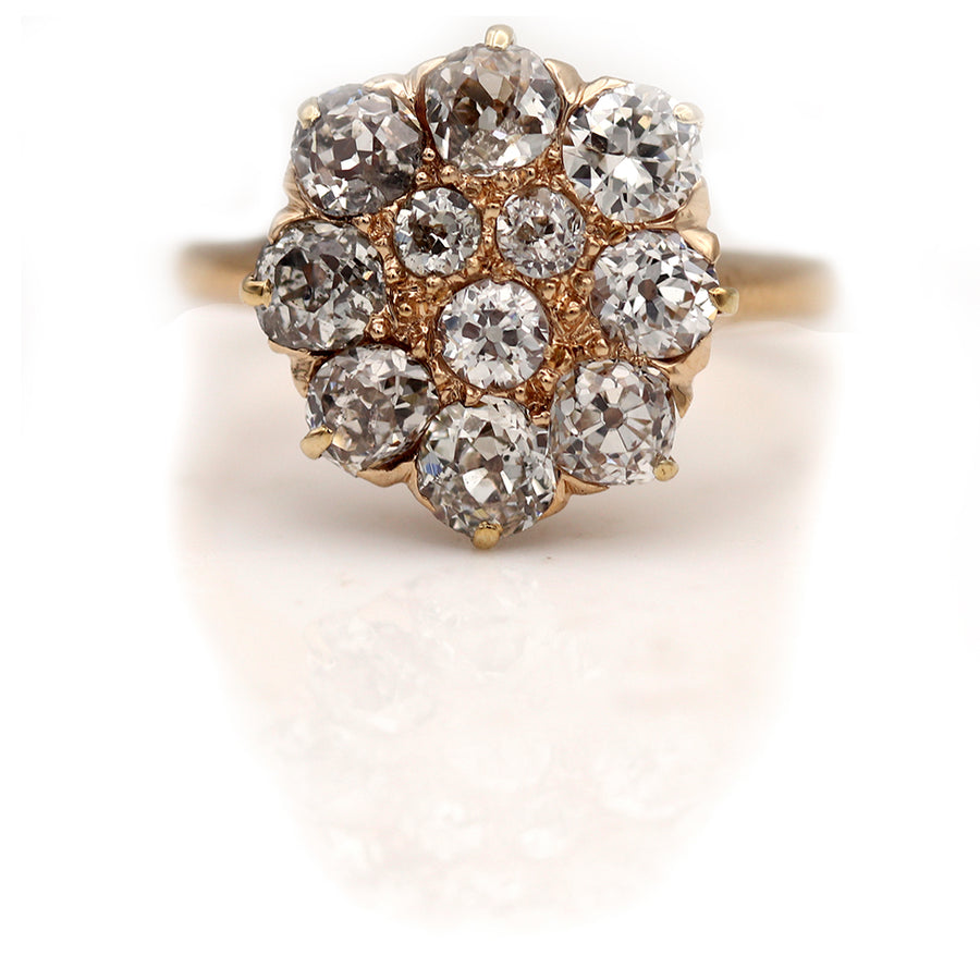 The Pell ring is an authentic vintage engagement ring from the Victorian era, circa late 1800's. This stunning ring features three (3) old mine cut diamonds surrounded by a delicate cluster of eight (8) old mine cut diamonds (weighing approximately 2.50 ctw with H-I color and SI1 - SI2 clarity). Beautifully crafted in 14 kt rosy-yellow gold, this is a timeless one of a kind beauty, in very good condition. Perfect to wear on either hand. L-v0x