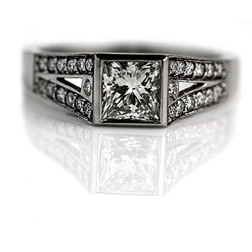 The Joelle ring is a VDR.com made vintage style engagement ring. The ring features a dazzling bezel set 1.00 carat GIA certified princess cut diamond of K color and SI2 clarity. The diamond is flanked by 26 round diamond accents. Beautifully crafted in recycled platinum with a delicate split shank, accentuated with milgrain engravings. In excellent condition.