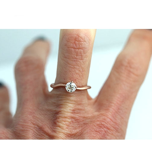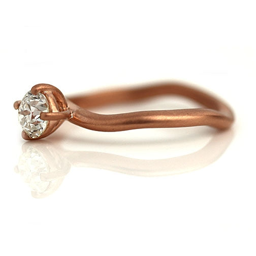 The Wave ring is a vintage inspired VDR.com-made diamond engagement ring, using an authentically antique diamond. The ring features an AGI certified antique .50 carat old European cut diamond of J color and SI2 clarity. The diamond resides in a 4-prong handcrafted 14 karat rose gold wave-like setting. Made with love in NYC. Contours the finger beautifully. (Also available in recycled platinum, yellow and white gold).