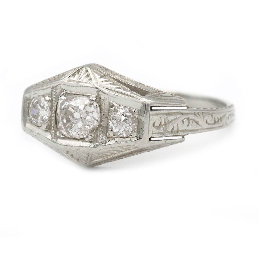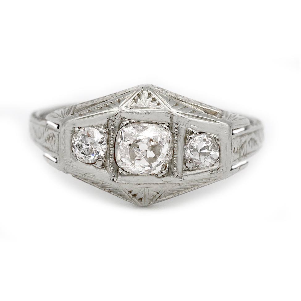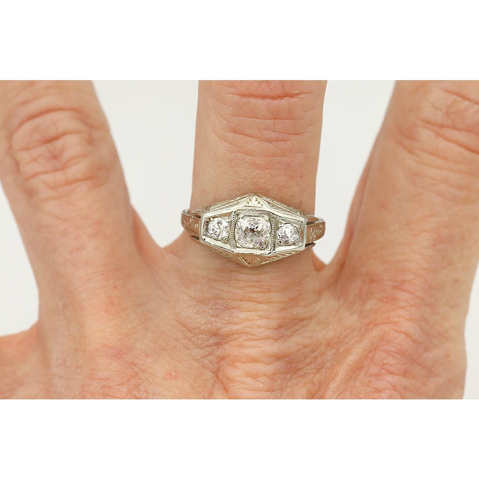 The Jess ring is an authentic vintage three-stone engagement ring from the 1920s. It features a central Old Mine cut diamond weighing approximately .40 carats, graded F color and SI2 clarity, set within a geometric square frame. The center stone is flanked by two Old Mine cut diamonds with a combined weight of approximately .25 carats. Crafted in 18 karat white gold, the ring is finished with open metalwork and intricate filigree engraving. An elegant and well-balanced vintage ring that can be comfortably worn on either hand, preserved in very good condition.